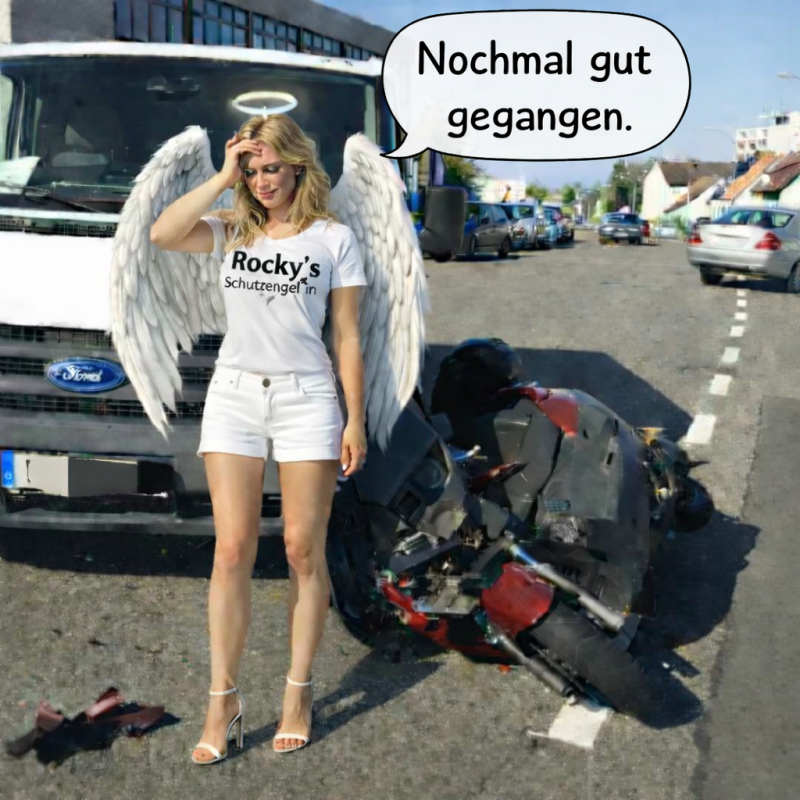 Mein Schutzengel*in hatte ganze Arbeit geleistet, ich hatte "nur" zerissene Klamotten, ein kaputtes Handy und am ganzen Körper schmerzhafte Abschürfungen - aber es hätte viel schlimmer ausgehen können. Noch heute klingen mir die Worte der Polizeibeamtin im Ohr: Wenn Sie der Fahrer des Rollers sind - wieso laufen Sie noch herum....